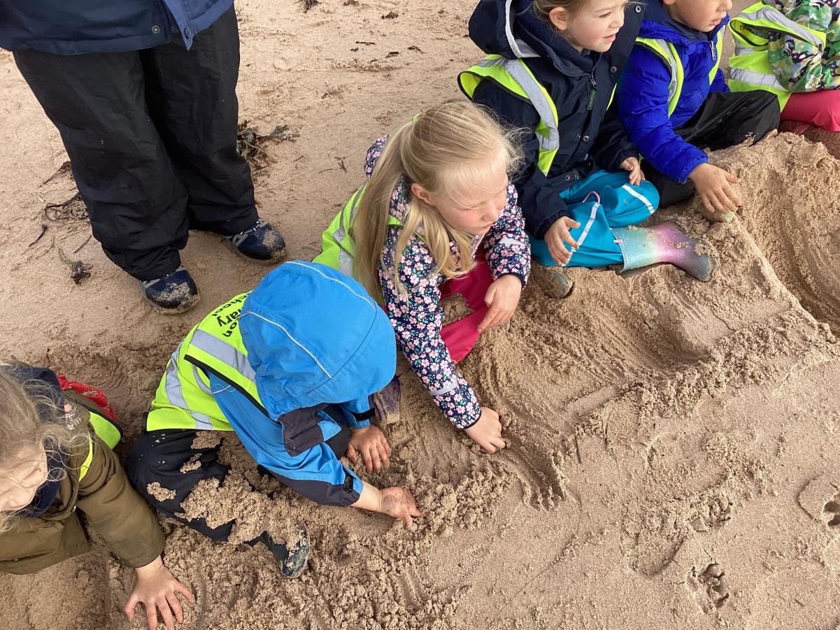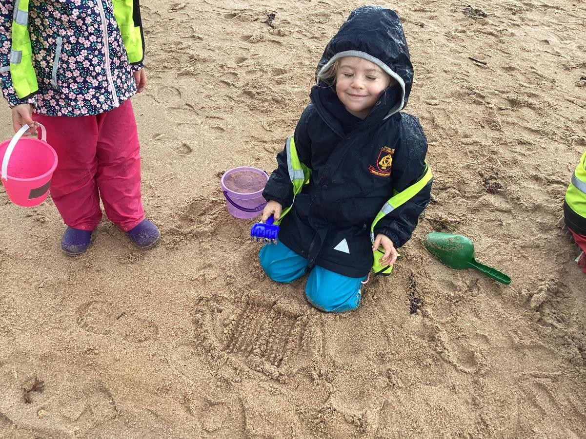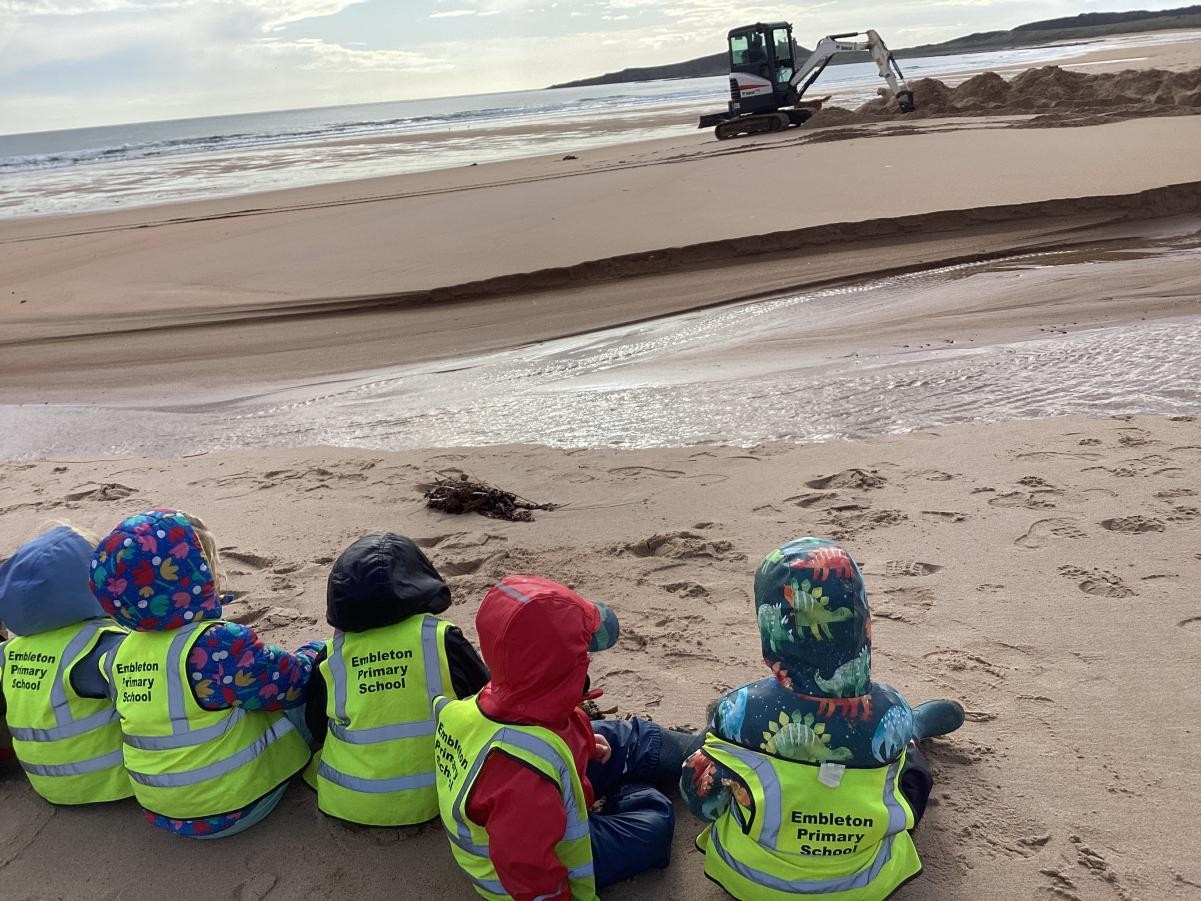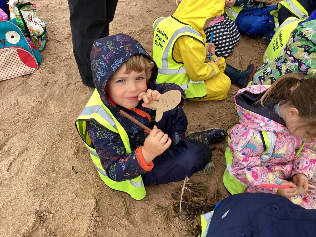 What a wet day today!!! It was a good job we were all prepared with wellies and waterproofs! Miss Murray said that it showed sunshine on her weather app so was disappointed with the rain! However, in true Embleton style, it didn’t dampen our spirits. We headed down to the beach and got our journals out while the sun was shining to write some more senses sentences. We were excited to watch the digger dig a channel to help the flood water drain back to the sea. As it started to drizzle we found a mark making tool, some used feathers and others sticks, to make a picture in the sand out of lines that we were practising in art. These pictures included wavy lines, zigzag lines as well as curved lines and dots. To keep ourselves moving and so that we didn’t get too cold we moved straight into our PE. Again we were practising our throwing and seeing if we could land our beanbag in a hoop. We were much more accurate with our throwing this week. As we began to head back up to school for lunch we took a detour to the bridges in order to see what they were made out of so that we could discuss it when we got back up to school. In the afternoon we discussed the bridges and properties of materials. We also practised drawing lines using music as a stimulus. We had so much fun responding to the music.