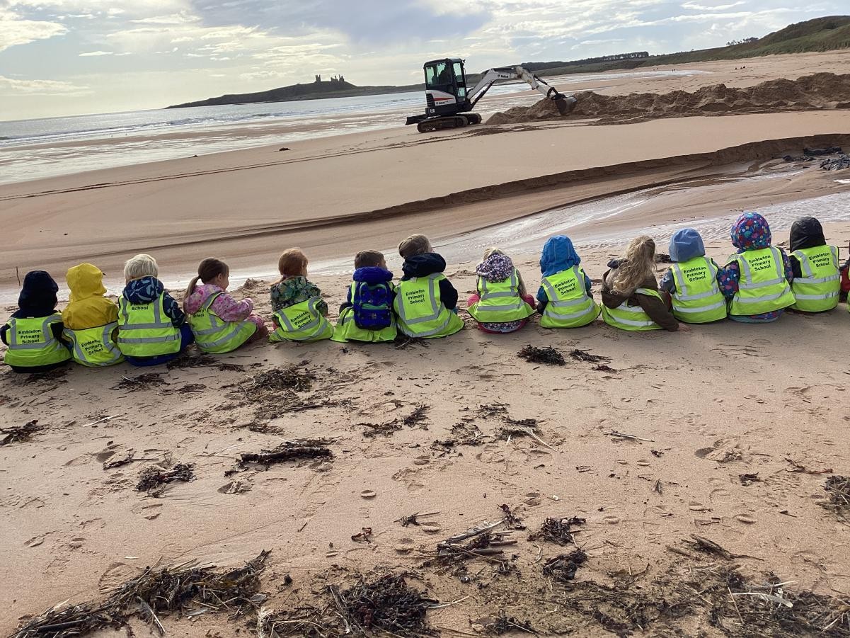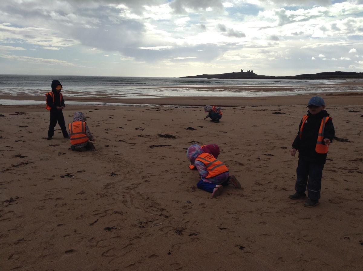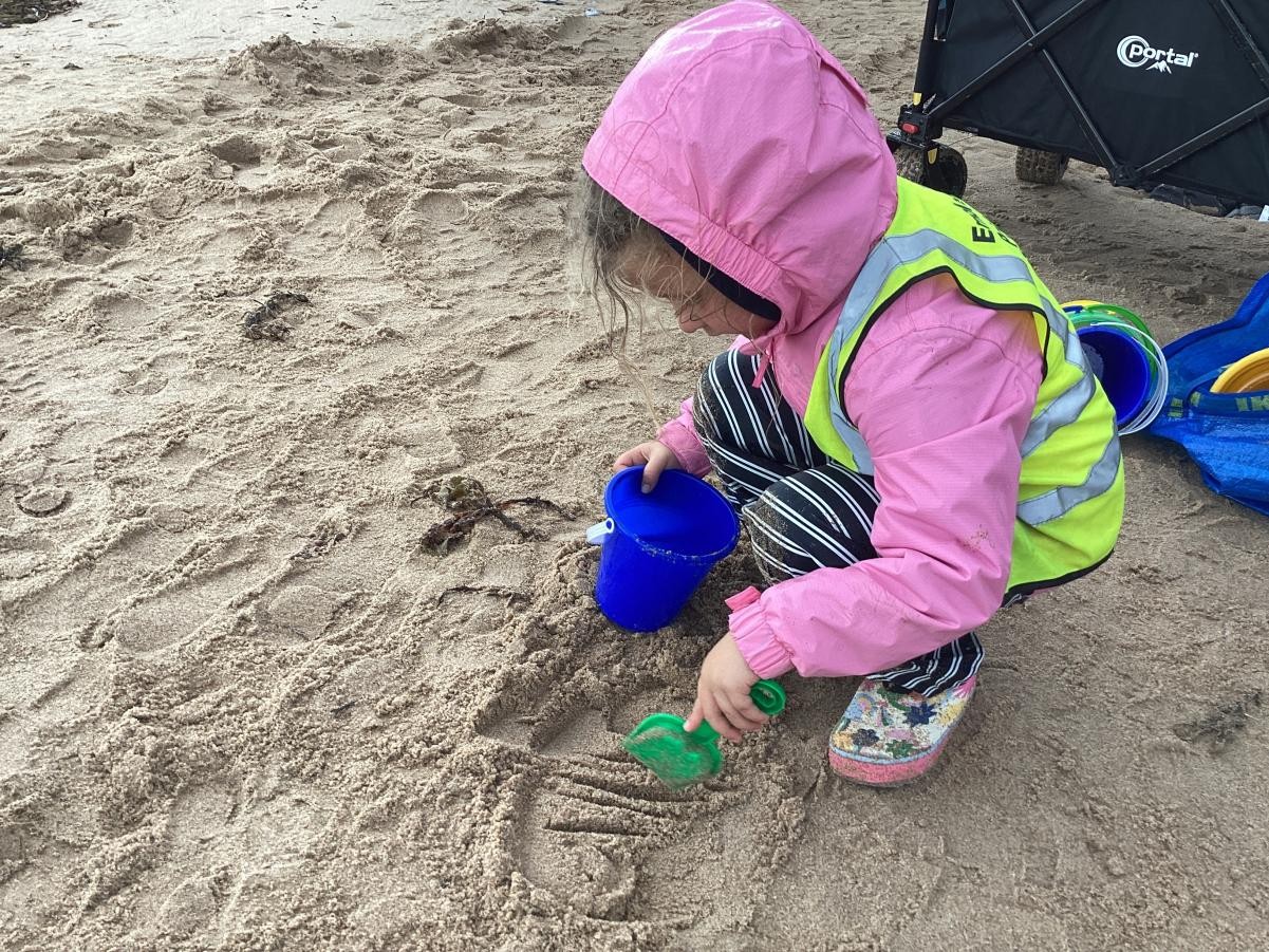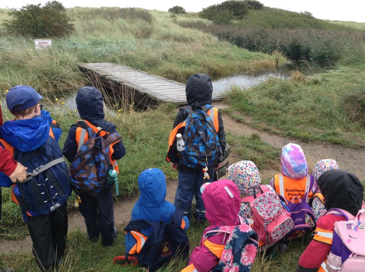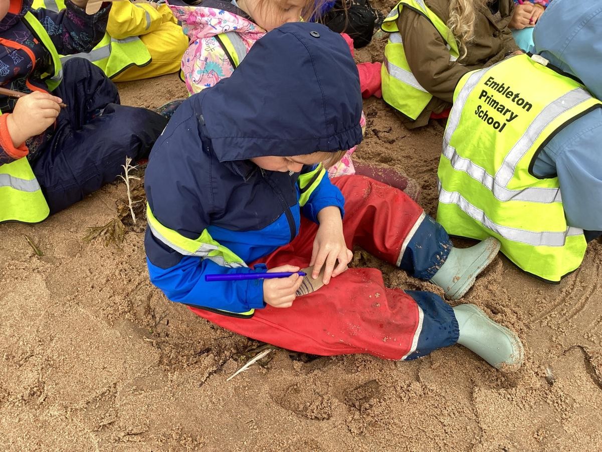 What a wet day today!!! It was a good job we were all prepared with wellies and waterproofs! Miss Murray said that it showed sunshine on her weather app so was disappointed with the rain! However, in true Embleton style, it didn’t dampen our spirits. We headed down to the beach and got our journals out while the sun was shining to write some more senses sentences. We were excited to watch the digger dig a channel to help the flood water drain back to the sea. As it started to drizzle we found a mark making tool, some used feathers and others sticks, to make a picture in the sand out of lines that we were practising in art. These pictures included wavy lines, zigzag lines as well as curved lines and dots. To keep ourselves moving and so that we didn’t get too cold we moved straight into our PE. Again we were practising our throwing and seeing if we could land our beanbag in a hoop. We were much more accurate with our throwing this week. As we began to head back up to school for lunch we took a detour to the bridges in order to see what they were made out of so that we could discuss it when we got back up to school. In the afternoon we discussed the bridges and properties of materials. We also practised drawing lines using music as a stimulus. We had so much fun responding to the music.